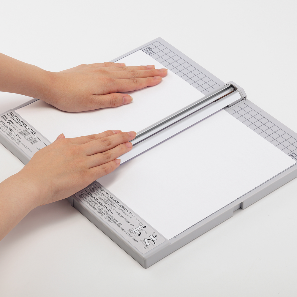แท่นตัดกระดาษขนาด A4 ที่สามารถพับครึ่งได้ ช่วยให้ประหยัดพื้นที่ในการจัดเก็บ น้ำหนักเบาเพียง 450 กรัม พกพาสะดวก ด้วยดีไซน์ใบมีดที่อยู่กลางแท่นตัด จึงสามารถตัดกระดาษได้ทั้ง 2 ฝั่งในครั้งเดียวโดยไม่ต้องคอยหมุนกระดาษ เหมาะอย่างยิ่งสำหรับงาน DIY เช่น ใช้ตัดขอบรูปถ่าย หรือประดิษฐ์การ์ดอวยพร มีมาตรวัดทั้งแบบเซนติเมตรและ Din Size ตามมาตรฐานสากล มาพร้อมใบมีดถึง 2 แบบทั้งแบบเส้นตรงและเส้นประ สามารถถอดเปลี่ยนได้ง่าย มี Cutter Mat รองรับใบมีดรูป 8 เหลี่ยม ซึ่งสามารถหมุนเปลี่ยนด้านได้เรื่อยๆเมื่อใบมีดไม่คม มีแผ่นยางตรงฐานแท่นตัด ช่วยป้องการการลื่นไหลขณะใช้งาน สามารถตัดกระดาษ 80 แกรมได้ครั้งละ 4 แผ่น