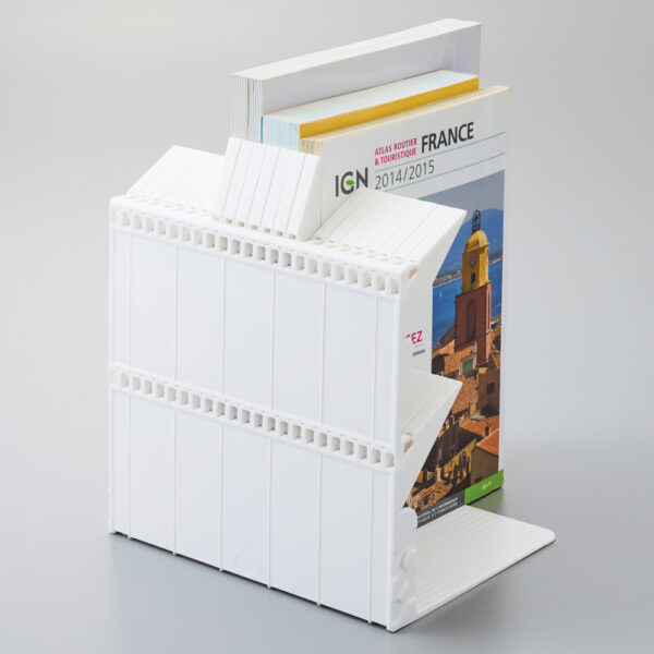 เมื่อใส่หนังสือเข้าไป ตัวกั้นของช่องนั้นจะถูกดันให้ยกขึ้น และตัวกั้นอีกสองฝั่งจะช่วยยึดหนังสือเอาไว้ ดังนั้นจึงมั่นใจได้ว่า แม้จะใส่หนังสือเยอะแค่ไหน ก็สามารถดึงออกได้ทีละเล่มโดยไม่ทำให้หนังสือเล่มอื่นๆล้ม สามารถใช้จัดระเบียบสิ่งของอื่นๆนอกจากหนังสือได้ เช่น CD หรือ DVD โดยความสูงของวัตถุต้องไม่ต่ำกว่า 12 ซม. ตัวที่กั้นมีข้อต่อทั้ง 2 ฝั่ง สามารถประกอบต่อๆกันหลายชิ้นได้ ขนาดที่กั้น 203 x 150 x 212 มม. มีให้เลือก 2 สี ขาว และดำ
