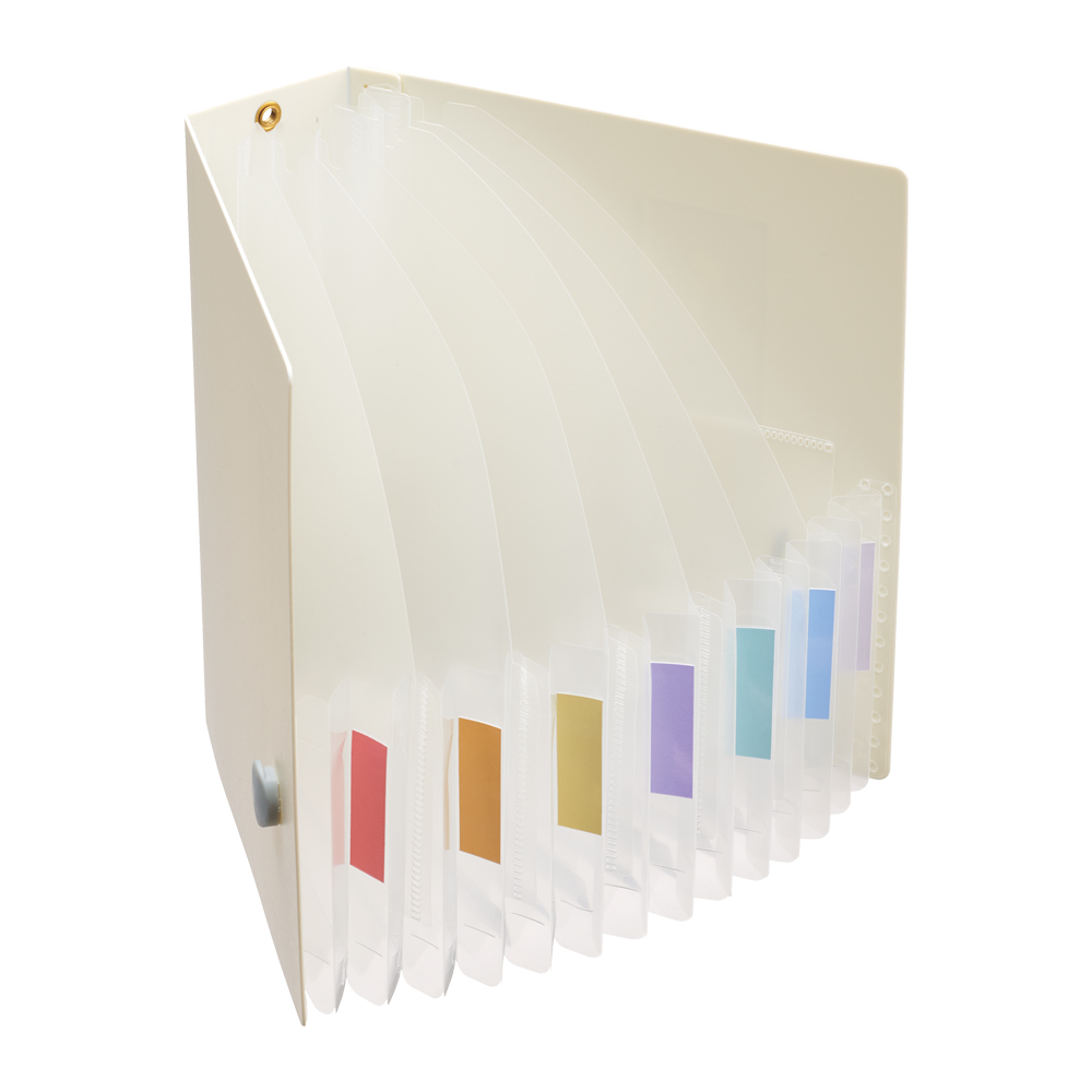 แฟ้มหีบเพลงขนาด B6 สำหรับจัดเรียงเอกสาร หรือสิ่งของต่างๆให้เป็นหมวดหมู่ เช่น ภาพถ่าย โปสการ์ด หรือแผ่นซีดี สามารถกางตั้งแฟ้มบนโต๊ะเพื่อง่ายต่อการหยิบใช้งาน มีสายรัดกระดุมป้องกันสิ่งของภายในหลุดหล่น มาพร้อมสติ๊กเกอร์ Index สำหรับเขียนชื่อเอกสารต่างๆ สันแฟ้มมีช่องสำหรับคล้องพวงกุญแจ จุเอกสารขนาด B6 ได้มากถึง 350 แผ่น ขนาดแฟ้ม 55 x 168 x 190 มม.