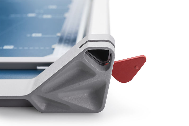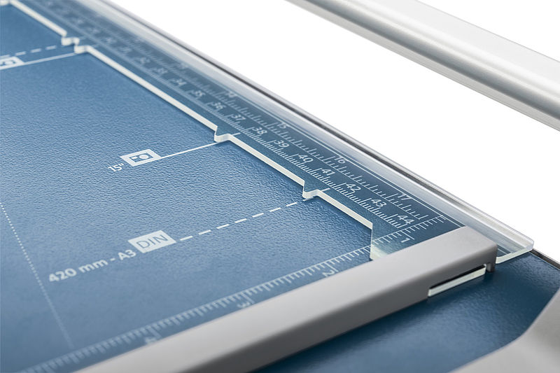 แท่นตัดขนาด 209 x 589 มม. ตัวแท่นเป็นโลหะ มีตัวจับยึดเอกสารแบบใส มองเห็นเอกสารได้ชัดเจนขณะตัด กล่องใบมีดพลาสติกถูกออกแบบให้จับถนัดมือและปลอดภัยในการใช้งาน ใบมีดเป็นแบบลูกกลิ้งทำให้ขณะทำงานใบมีดและฐานรองรับจะสัมผัสกัน ซึ่งจะช่วยให้ใบมีดคมอยู่เสมอ มีมาตรวัดเป็นเซนติเมตร ทั้ง 2 ด้าน และมี Din Size บอกขนาดกระดาษตามมาตรฐานสากล เพิ่มความสะดวกในการใช้งาน หน้ากว้างกระดาษที่ตัดได้ 460 มม. (A3) สามารถตัดกระดาษได้หนา 0.6 มม. (70 แกรม 6 แผ่น, 80 แกรม 5 แผ่น) / ครั้ง น้ำหนัก 1.3 กิโลกรัม